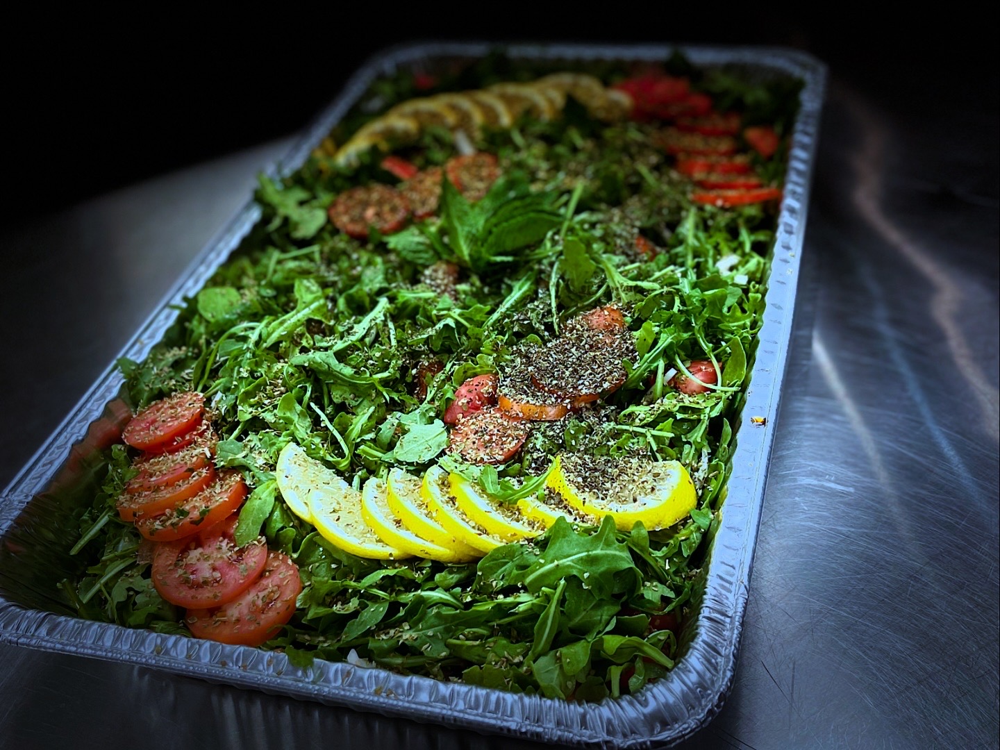 A simple salad made with arugula, onions, and tomato with a side dressing of lemon juice, olive oil, and vinegar. The perfect accompaniment to each meal.