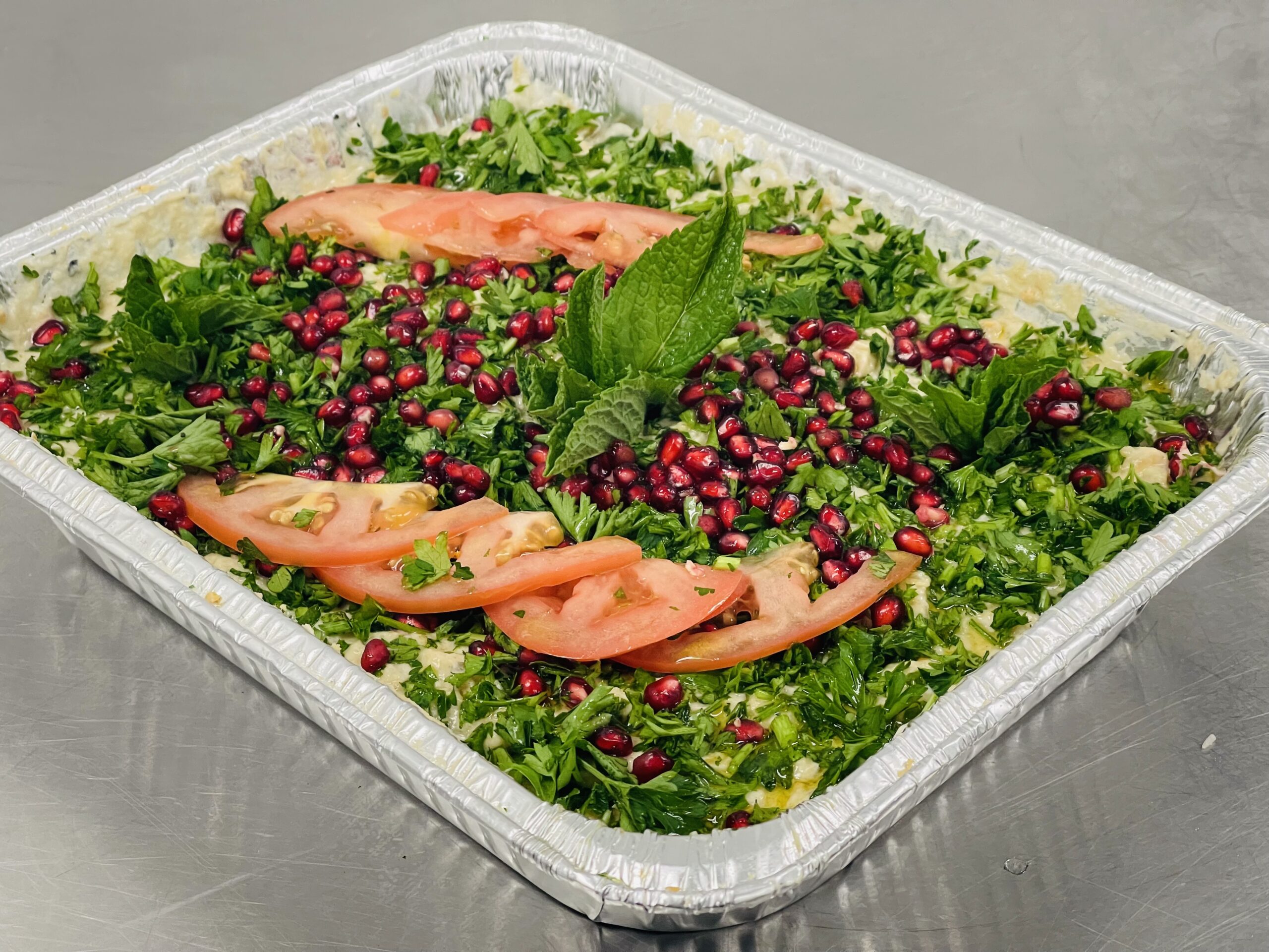 A famous Mediterranean salad made with lettuce, tomatoes, parsley, onion, fresh mint, and green, red, and yellow peppers and topped with crunchy pita chips. A separate dressing of olive oil, pomegranate molasses, lemon juice, and vinegar is included.